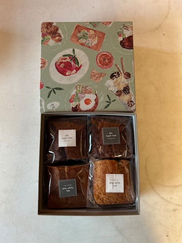 年末年始の贈り物にもお使いいただける パウンドのハーフサイズだけを集めたセットです。 いろんな味を少しずつ、好きな分だけ分け合えるサイズです。 オリジナル箱に入れてお届けします。 (手提げ袋はオプションです) 【set内容】 全てハーフサイズです(約7cm四方) 切り分けてお召し上がりください。 栗パウンド(季節限定) 自家製の渋皮煮、栗ペーストをたっぷり混ぜ込んだ贅沢なパウンドです。 どこを食べても栗になるようにたくさん入れています。 この時期だけの特別なパウンドです。 ※栗を煮る時に洋酒を使用しています。 ウィークエンド オープン当時から変わらぬ人気のウィークエンド。 上の部分はグラス・ア・ロではなく、自家製レモンシロップで仕上げています。 余分なものを入れていないので、どの年代の方にもお召し上がりいただける思います。 マーブルパウンド グルノーブルという、くるみが特産の地方のフランス菓子を ベースにしています。 くるみが入った生地とチョコレートの生地をマーブル状にして焼いているので当店ではマーブルパウンドと呼んでいます。 お子さんでも食べやすい、シンプルですが王道のお菓子です。 フルーツケーキ 自家製ラムレーズン、自家製柑橘ピール、ナッツをたくさん入れており、生地というよりはフルーツやナッツを食べてもらうためのパウンドです。 薄く切ってワインのお供にもいいかと思います。 ※お酒が入ってますので、お酒の弱い方はご注意下さい。 ※ご注意、ご確認下さい!※ 必ず文章を全てご確認いただいてからご注文下さい。 状況により注文後すぐに発送伝票を作ることもあるので、 注文完了後の変更はお受け出来かねます。 時間指定がある方は備考欄にご記入お願いいたします。 ヤマト運輸さんから発送していますので、クロネコメンバーズに登録いただければこちらからの発送後も日時変更できます。 ぜひそちらもご利用下さい。 尚、同一住所に複数ごお届けの場合は送料が変わりますので、クレジット決済をお選びいただきますようお願い致します。 (クレジット以外の決済では送料の変更ができず、個数分の送料が請求されます) ・BASE発行の値引きクーポンをご使用の場合はクレジット決済でも送料のおまとめはできません。 梱包代、税込 料金と別に送料(クール便)がかかります。 卵、乳製品、小麦、ナッツ、使用 賞味期限 2〜3週間程度 (商品により変わります) 保存方法 20度以下の涼しい場所 準備出来次第順次発送いたします。 (26日ごろの発送を予定しています) ※着日指定はできませんが時間指定はお受けできます。 ご希望のある方は備考欄にご記入下さい。 午前中/14時-16時/16時-18時/18時-20時/19時-21時