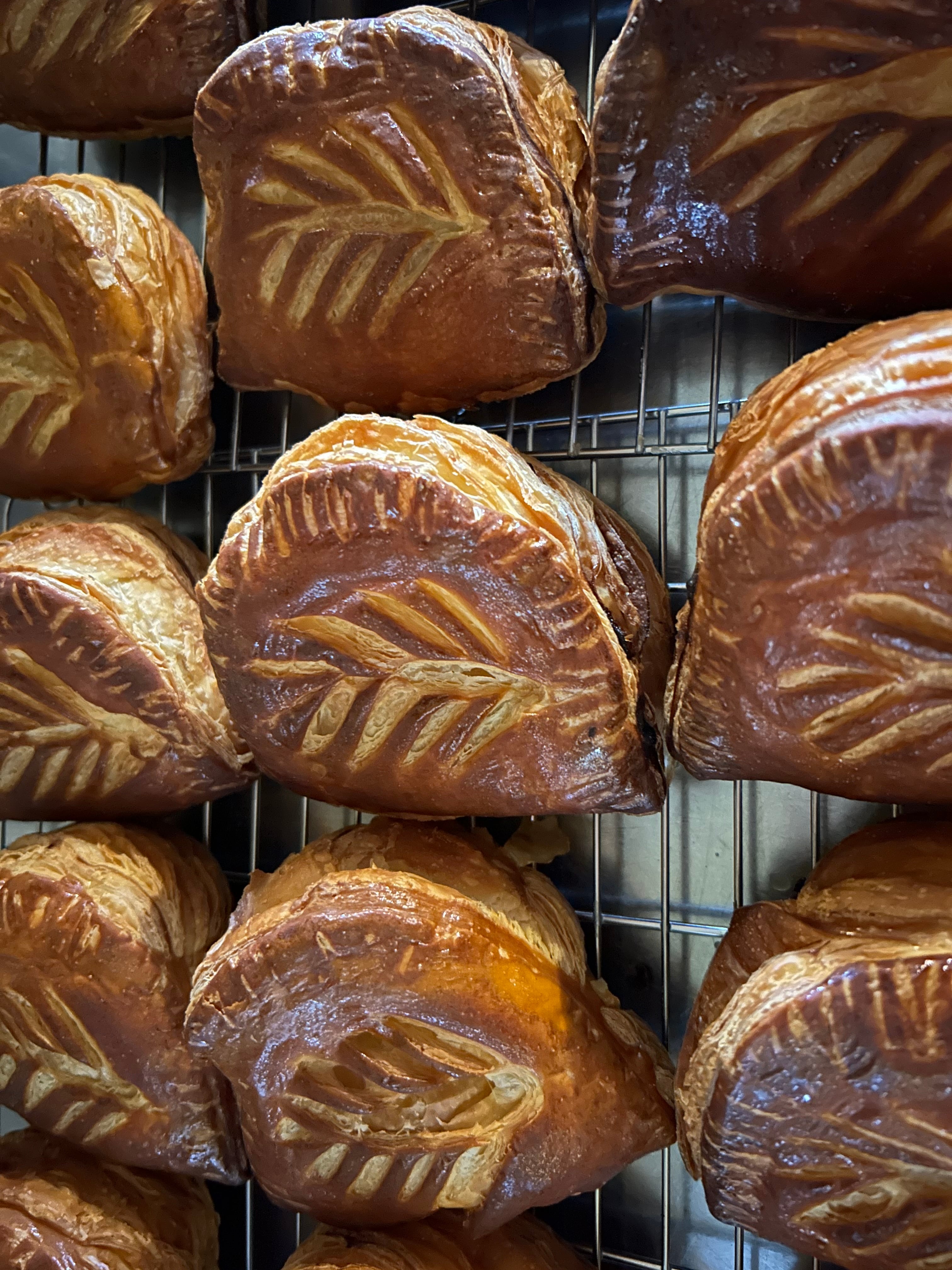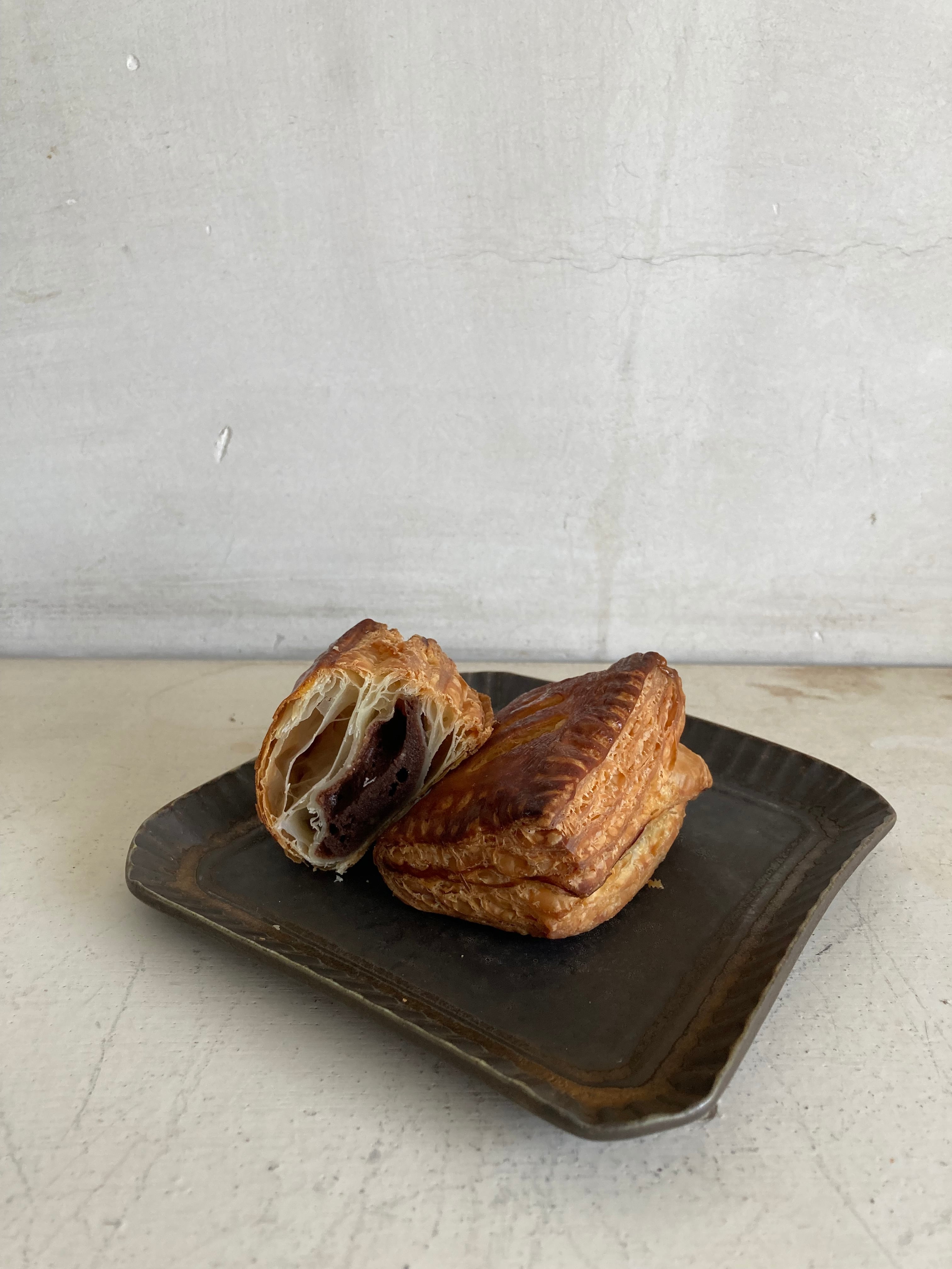 ヴァローナのチョコとチョコ味のクレーム・フランジパーヌ(カスタード+アーモンドクリーム)をパイ生地に包みました。