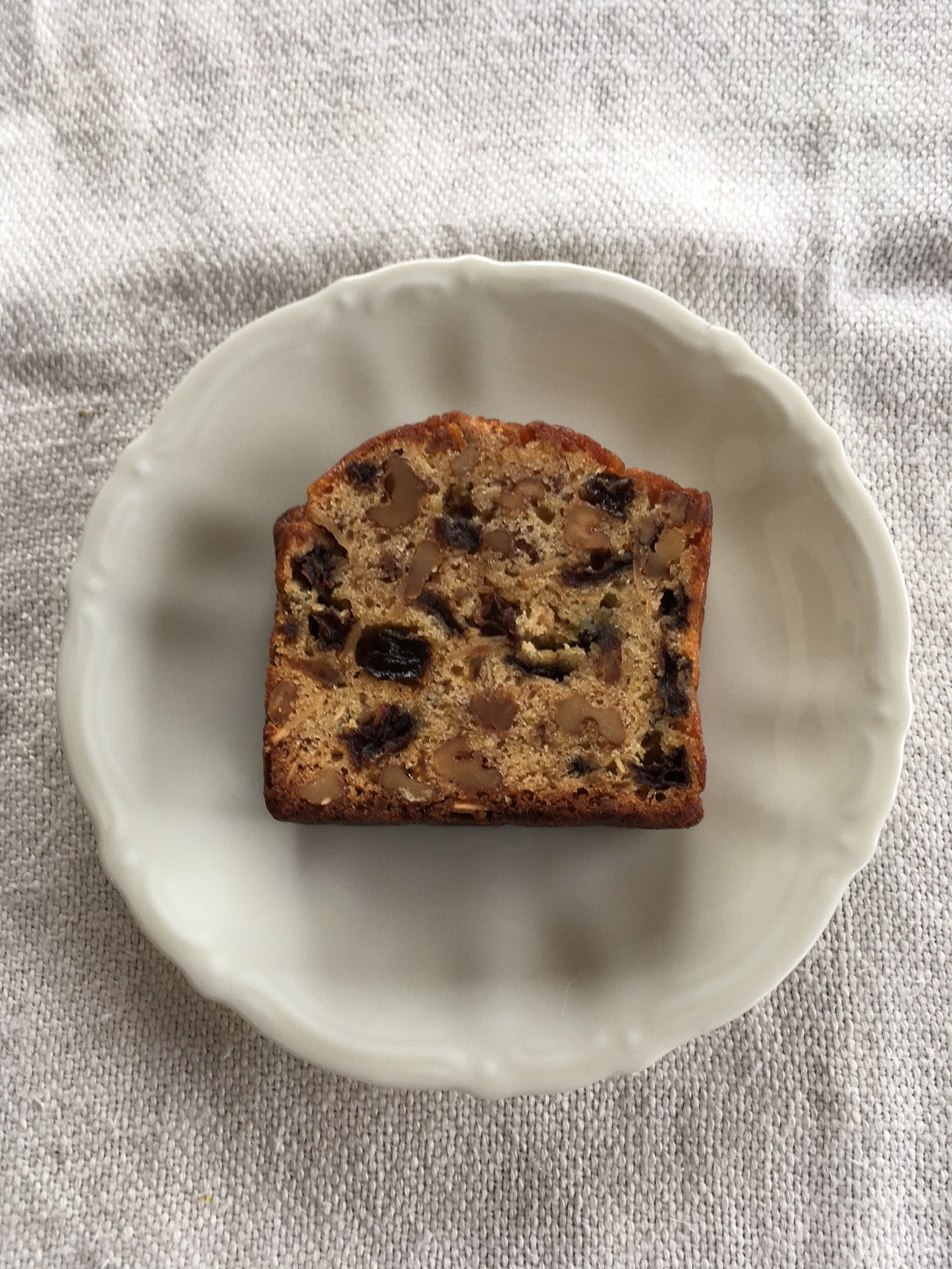 自家製ラムレーズン、自家製柑橘ピール、ナッツをたくさん入れており、生地というよりはフルーツやナッツを食べてもらうためのパウンドです。